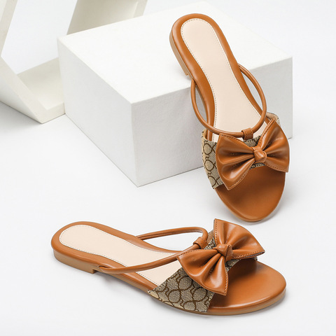 รองเท้าแตะผู้หญิงหนังแท้ส้นเตี้ยพร้อมเปิดนิ้วเท้าและพื้นรองเท้ายางรองเท้าสลิปเปอร์ออกแบบโลโก้ด้วยคริสตัลสีสันสดใส